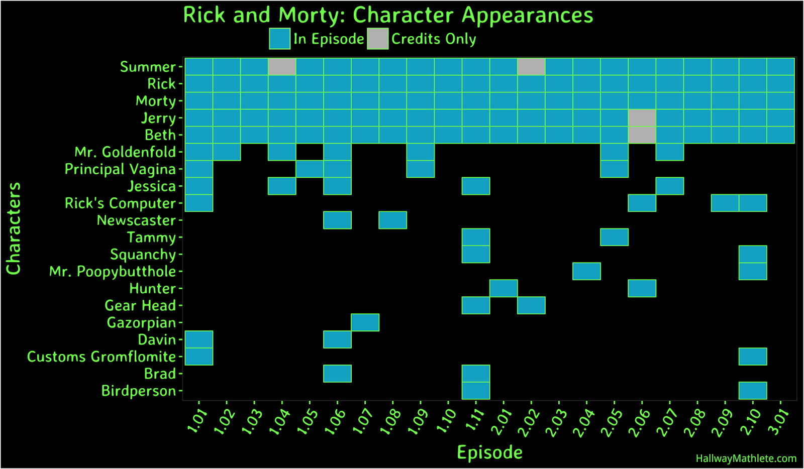 Justin Roiland and Dan Harmon have a special ability to write unique characters that audiences love. Below is a chart of recurring characters from the show. This data is from the credits. Sometimes characters are not in the episode, but are still in the credits. When this happens, the character is represented with a gray box.